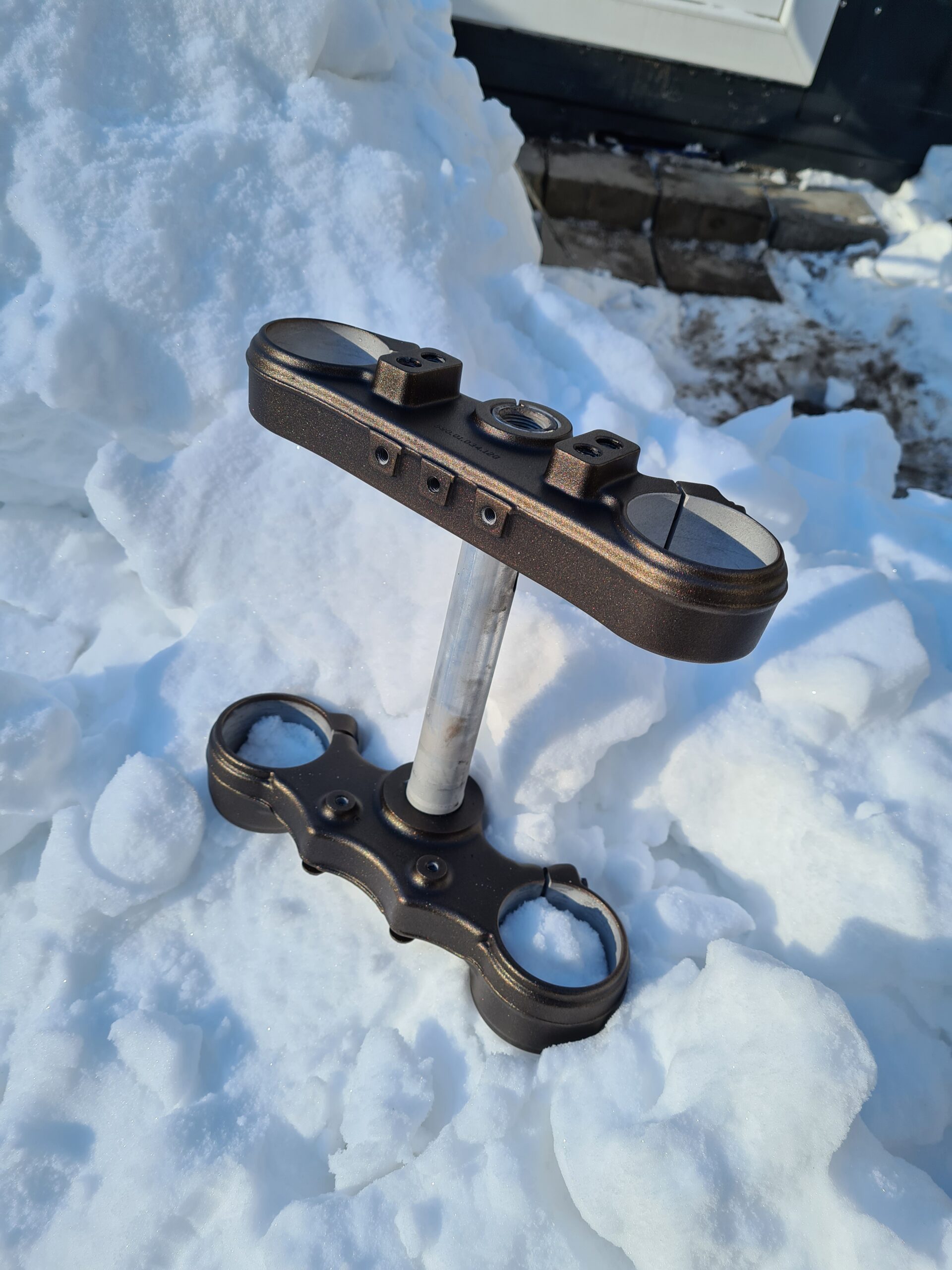 Wir bieten dir hiermit die Pulverbeschichtung deiner Supermoto / Mx Gabelbrücke inkl. Steuerrohr aus- und einpressen an.