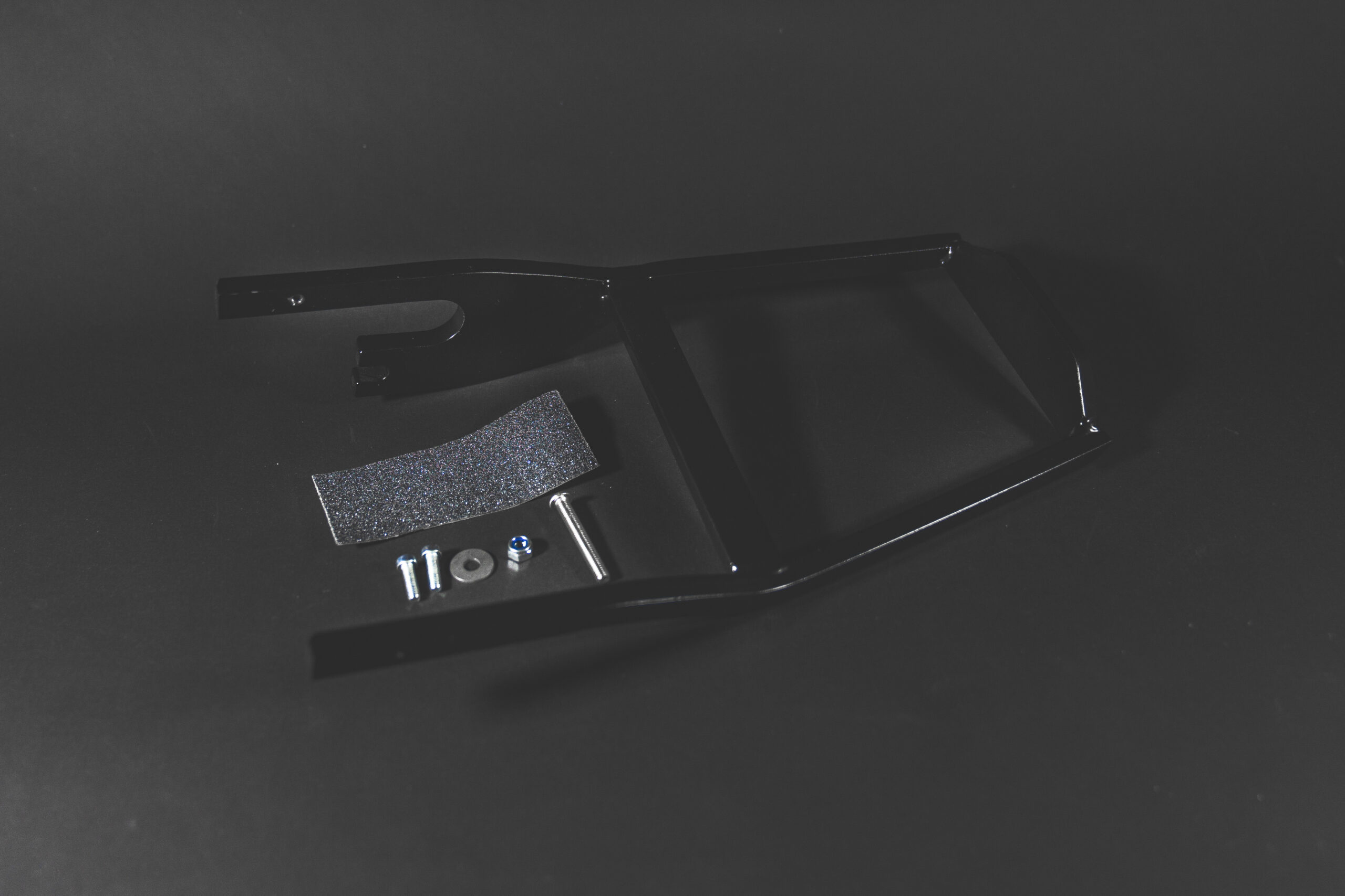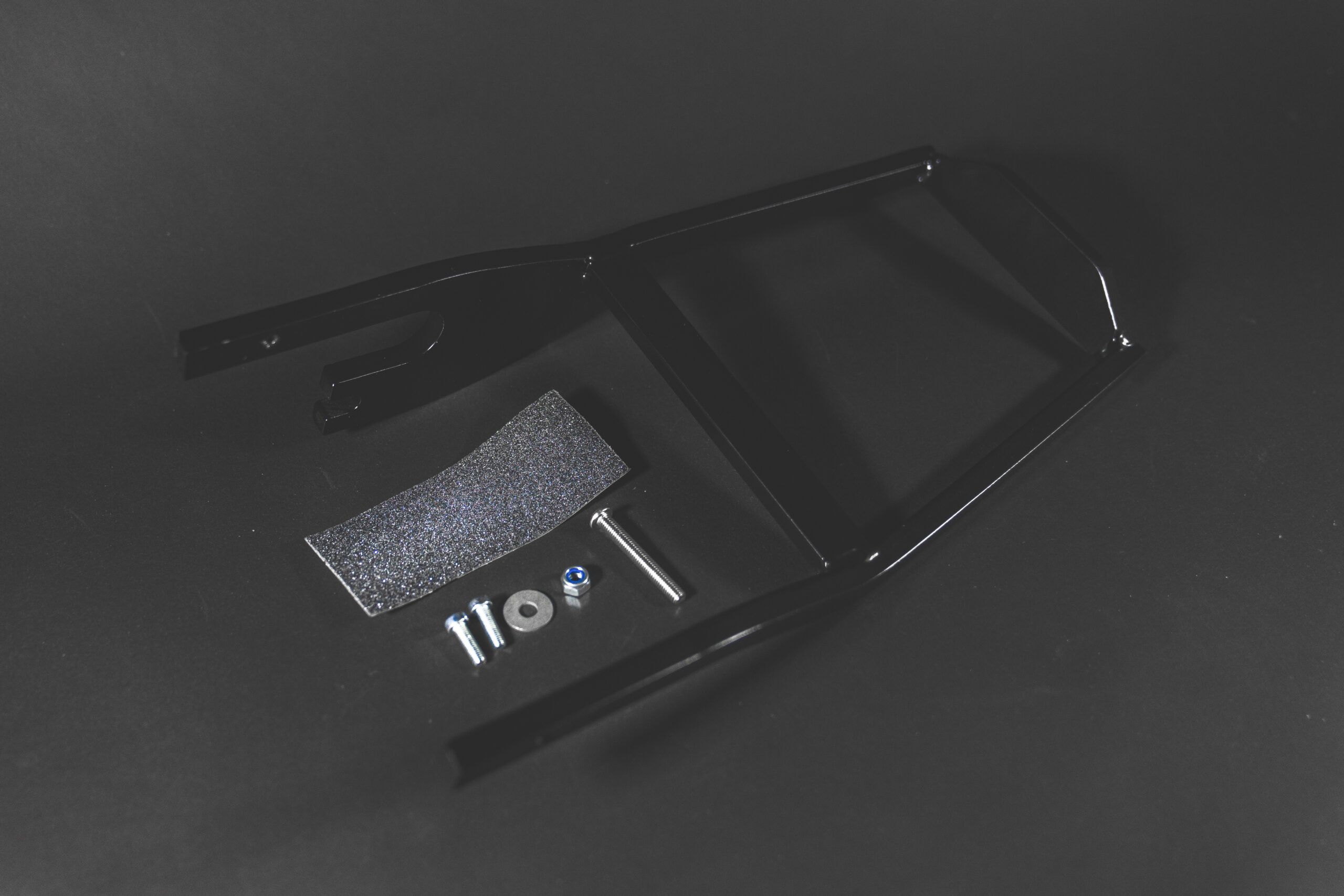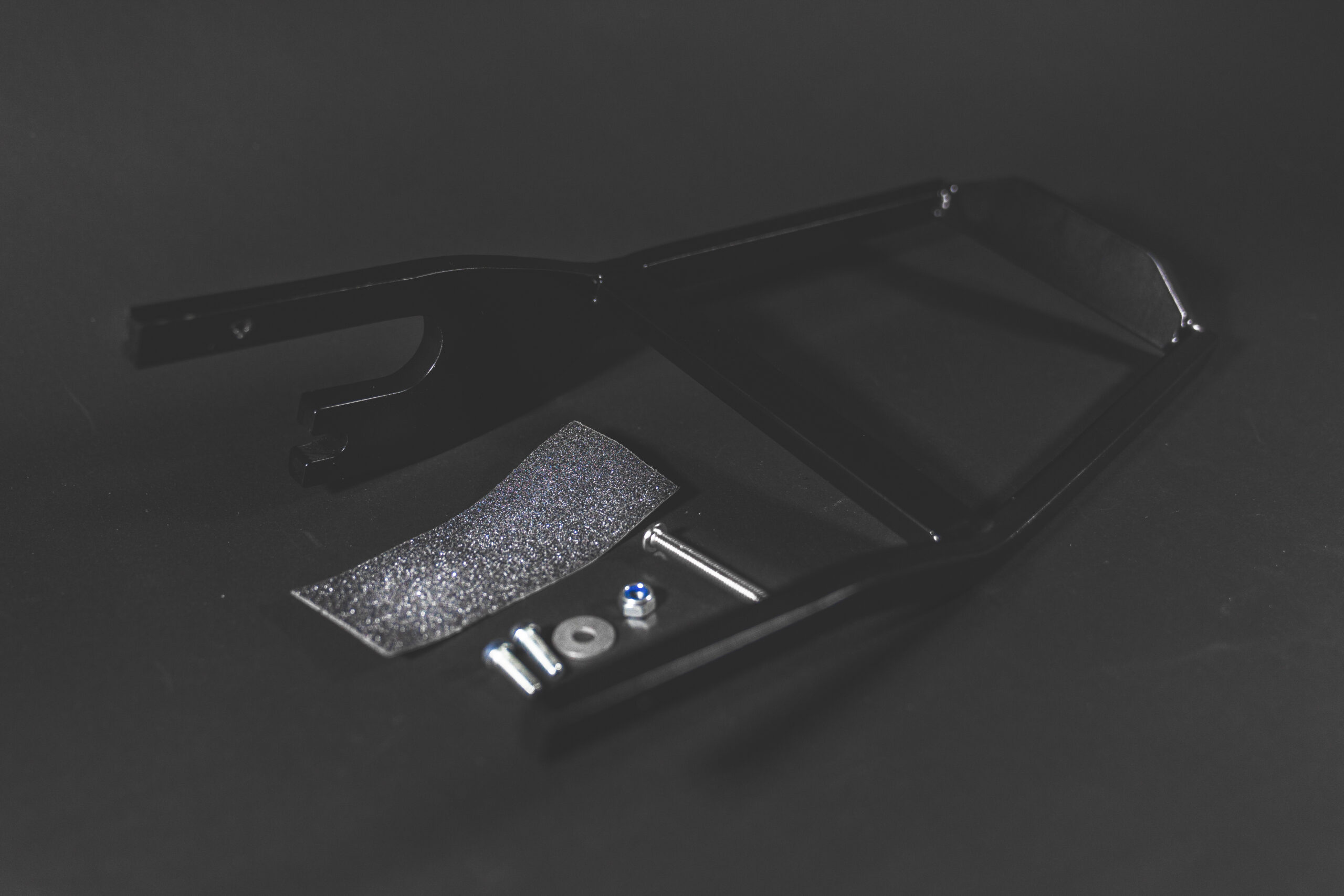 Delete all rear plastics of your bike. You have to grind the wheelie bar because all original subframes are not 100% the same. Use a flashlight to see where your subframe is welded from the inside. Than grind the wheelie bar on the right places to fit in the subframe until it fits good to your exhaust bracket. Now drill holes to fix the wheelie bar with the included screws.