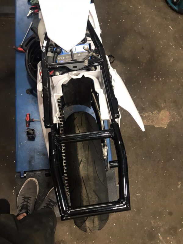 Bei den neueren EXC Modellen ab 2017 ist es leider nicht mehr möglich, die Wheelie Bar von außen am Heckrahmen zu verschrauben, man muss also „leider“ in den Rahmen rein gehen. Diese sind von KTM alle anders verschweißt. Das heißt ihr müsst leider noch ein bisschen anpassungsarbeit an der Wheelie bar vornehmen. Am besten leuchtet ihr mit einer Taschenlampe in den Heckrahmen hinein und schaut wo der Heckrahmen „durchgeschweißt“ ist. An den Stellen wo von innen Schweißnaht zu sehen ist, nehmt ihr jetzt mit einer Flex Material an der Wheelie Bar weg, bis die Wheelie Bar vollständig in den Heckrahmen hinein rutscht, und die Kerbe perfekt auf eurer ‚Endschalldämpfer Halterung sitzt.